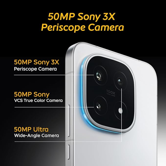 - CAMERA: Triple camera setup – 50MP Sony 3X Periscope Camera, 50MP Sony VCS True Color Camera, 50MP Ultra Wide-Angle Camera with an Upgraded 32MP Selfie Camera and 4k Video Recording. Humanistic Street Photography Camera along with AI visual effects and AI reflection erase.